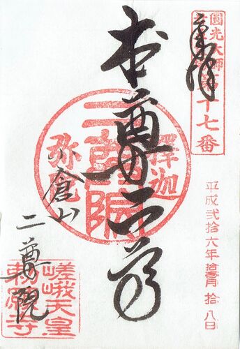 京都市右京区の嵯峨野にある天台宗・二尊院の御朱印「本尊二尊」。釈迦如来・阿弥陀如来のこと。 【PR】全国の寺社から美しい・珍しい御朱印を厳選した御朱印本!【PR】 【Amazon】 永久保存版 御朱印アートブック 作者: 菊池洋明 出版社/メーカー: PHP研究…