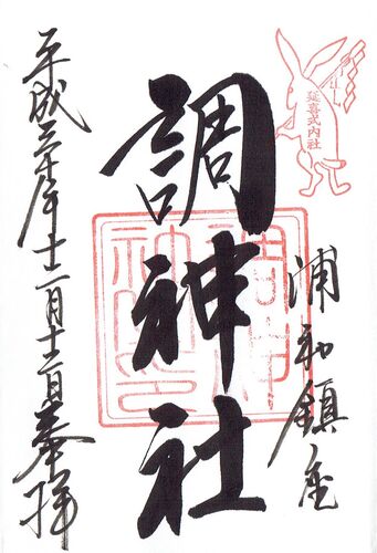 埼玉・浦和にある調神社(つきじんじゃ)の御朱印と御朱印帳。 調神社の御朱印。右上のウサギの押印が特徴的です。「中世、調が月と同じ読みから月待信仰に結びつき、江戸時代には月読社とも呼ばれ、月神の使いとされる兎の彫刻が旧本殿や社殿に狛犬の代わり…