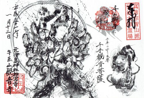 愛知県津島市にある牛玉山・観音寺の超絶アートな御朱印。以前は平成31年1月現在は手書きの絵付き御朱印は授与されておらず、絵部分は印刷の書置き御朱印(複数の絵柄)が指定日に授与されているようです。 平成31年1月に授与された絵付き御朱印(絵部分…
