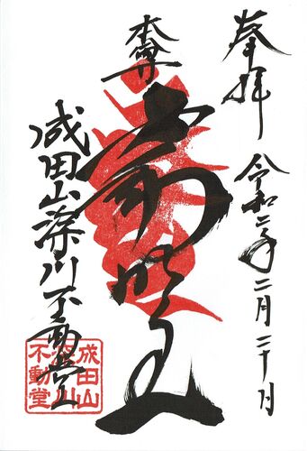 東京都江東区にある深川不動堂。成田山新勝寺の東京別院です。 御朱印は通常のものが2種類。参拝した際は、2月限定で開運出世稲荷の「荼枳尼天」の御朱印も授与されていました。 深川不動堂オリジナル御朱印帳。梵字がびっしり! 深川不動堂境内点描 境内社…