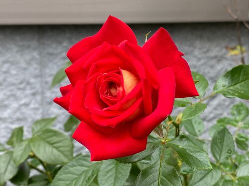 京成バラ園作出品種「希望」が咲きました! 花弁の裏側が黄色なのが特徴です。燃えるような情熱の赤色に、明るい未来を期待する黄色。希望という品種名に相応しいバラです。