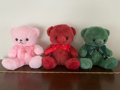 ハッピーバースカラーベア(HappyBirth Color Bear)!家族の誕生月のベアをゲットしました!可愛い!! 1月ガーネット(勝利・真実) 5月エメラルド(愛・幸運) 10月ピンクトルマリン(愛情・熱心)