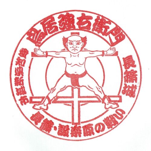 武田勝頼公と織田信長が激戦を繰り広げた長篠古戦場跡と長篠城址。 鳥居強右衛門の磔図がデザインされた長篠合戦のスタンプ 日本百名城・長篠城址のスタンプ 長篠城址