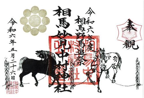 相馬野馬追祭の日(2024年5月26日)に巡拝した相馬妙見三社(相馬中村神社、相馬太田神社、相馬小高神社)の御朱印です。 相馬中村神社でいただいた相馬野馬追限定の御朱印!平将門公由来の九曜紋が輝いています。 相馬中村神社の通常版御朱印 相馬氏の遠祖…