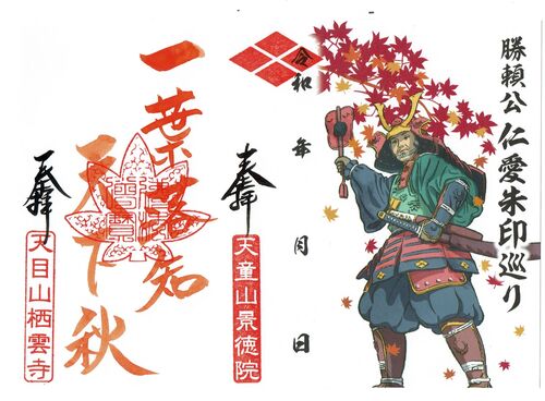春と秋に定期的に頒布されている景徳院・栖雲寺コラボ武田勝頼公特別御朱印。今回は「一葉落知天下秋」〜11/16までの土日限定。 武田家終焉の地として知られ、天正10年(1582年)に武田勝頼・信勝父子や家臣がここで自刃し、武田氏が滅亡した場所に建つ景徳…