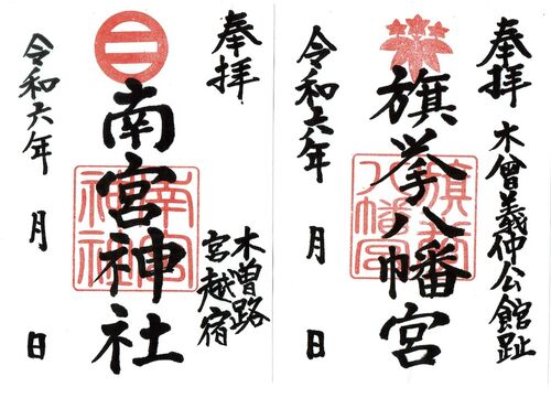 木曽義仲が平家打倒の旗挙げをした地に建つ旗挙八幡宮と義仲が南宮大社から勧請し建立したという南宮神社の御朱印。 旗挙八幡宮境内の大欅は木曽義仲が元服の際に植えられたとも伝えられ、樹齢800年以上という。 地名の日義は、 朝「日」将軍・木曾「義」仲…